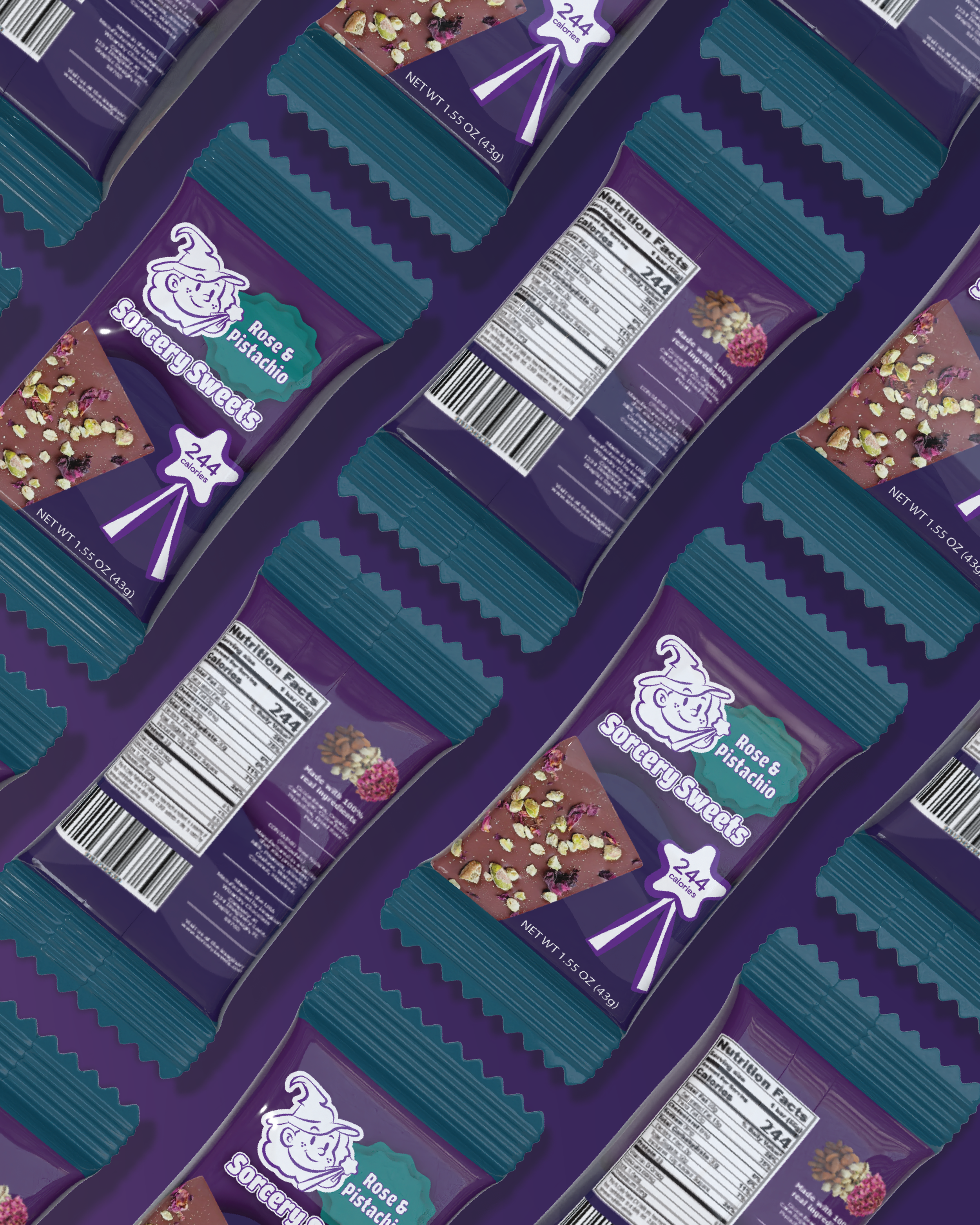 Sorcery Sweets is a conceptual chocolate brand that combines bold flavors with a whimsical aesthetic. The brand identity is complete with a cool-toned color palette, illustrated logo, custom pattern, and mock chocolate bars for packaging reference.