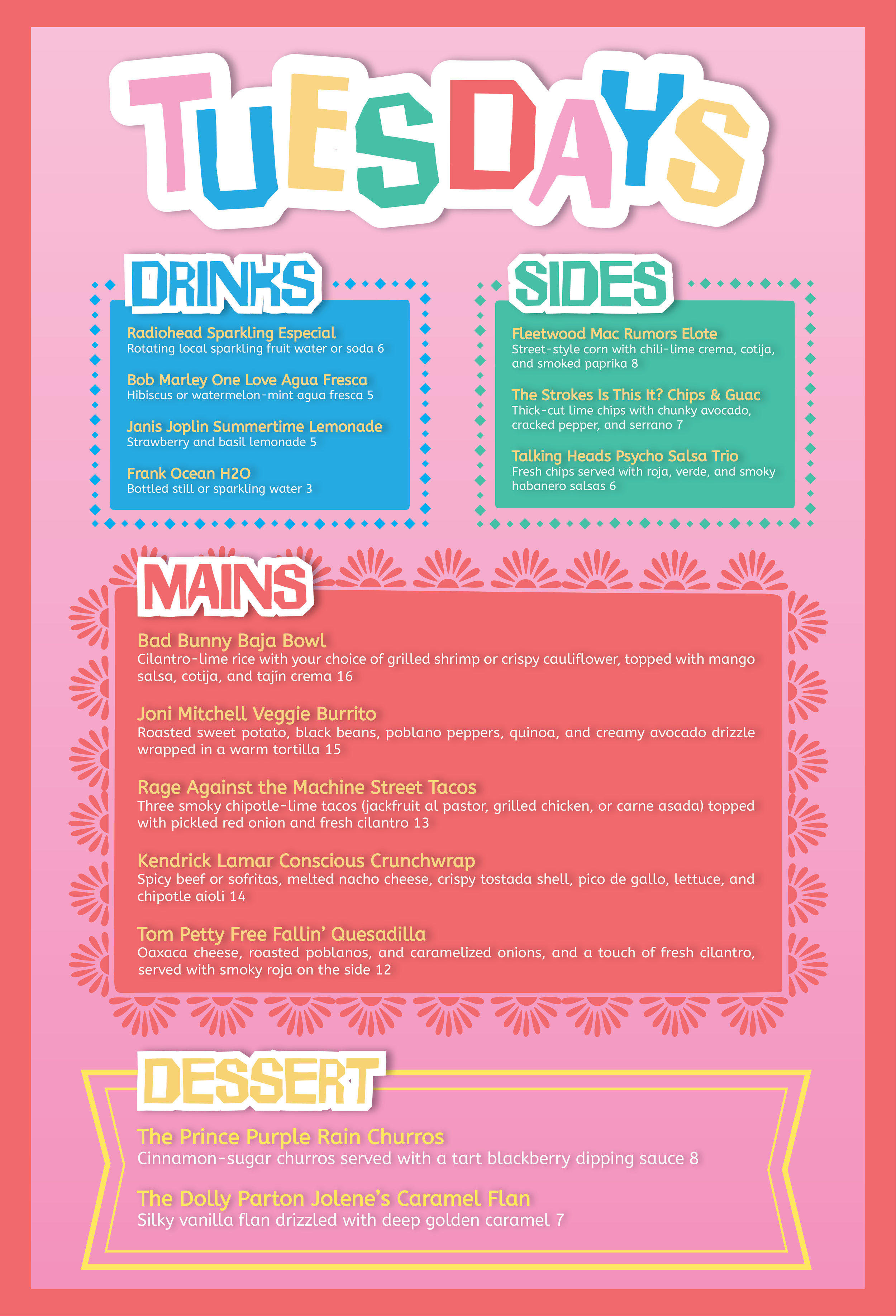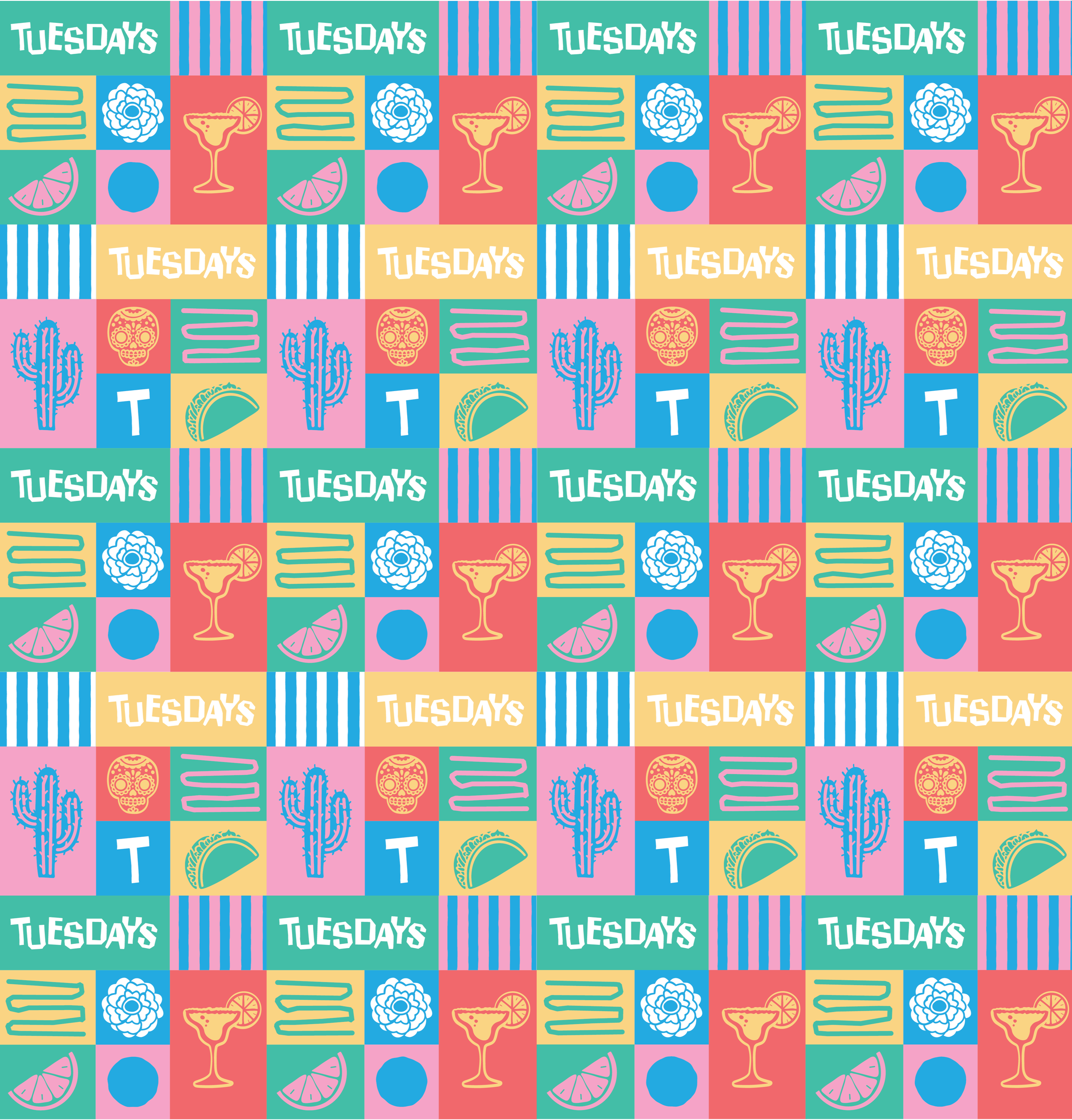 Tuesdays is a conceptual food truck brand crafted to blend Mexican cuisine with a love for artistry and music. The bold graphics and playful colors bring about a vibrant, high-energy identity that mirrors the rhythm and soul of street music.